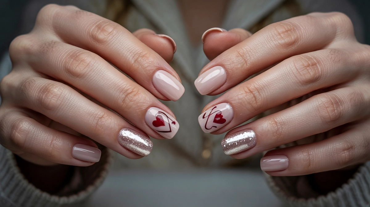 valentine’s day nails with discreet decoration close-up